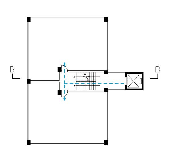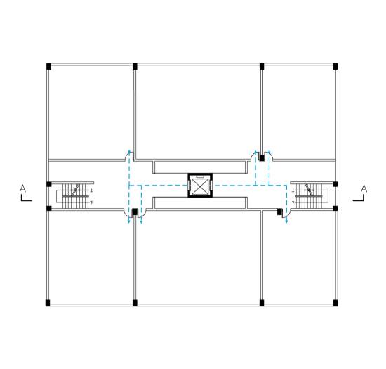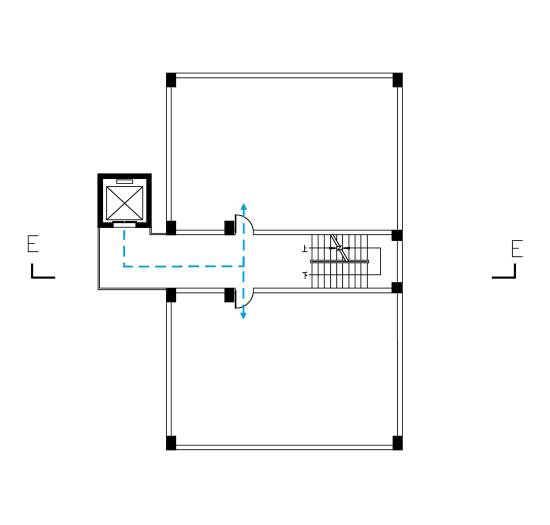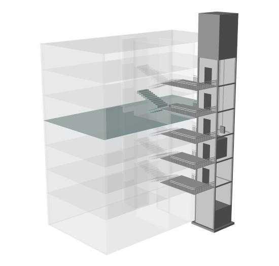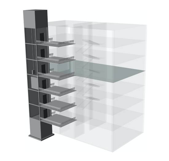 天井平臺式即A和B兩棟樓宇共用同一部電梯,通常適合于倆樓并排同向,且樓梯或樓層通道對稱,電梯前后搭個連廊即可實現出入倆樓,是一種較常見的創新方法。