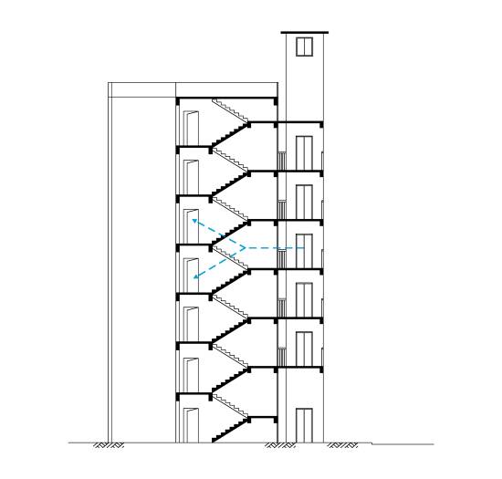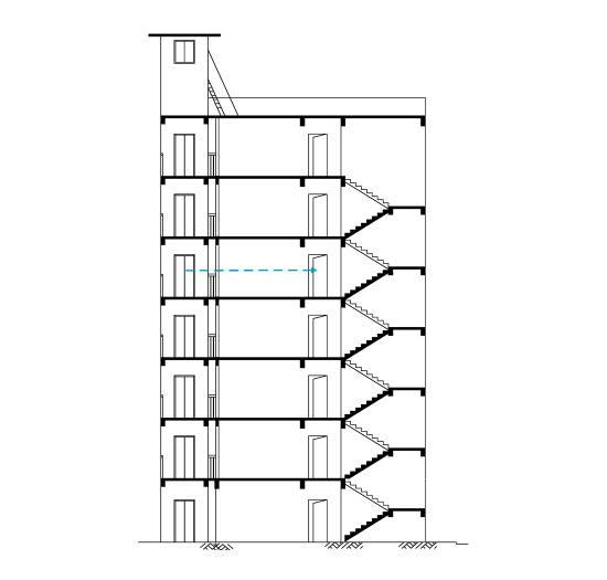 平層入戶是指電梯出入口位于樓梯平面,實現乘坐電梯直達指定樓層。直平臺式(平層入戶)可從住宅樓正面實現入戶,要求建筑物的正面空間足夠寬廣,加裝電梯后進出樓梯的距離滿足相關安全走火通道等要求。